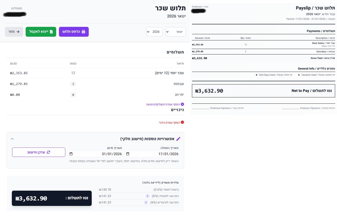 • דו"ח דו-לשוני: הדו"ח המופק (וכן קובץ ה-Excel לייצוא) מופיע בעברית ובאנגלית. כך מובטח ששני הצדדים – המעסיק והעובד – מבינים בדיוק את מרכיבי השכר, מה שמגביר את השקיפות והאמון.